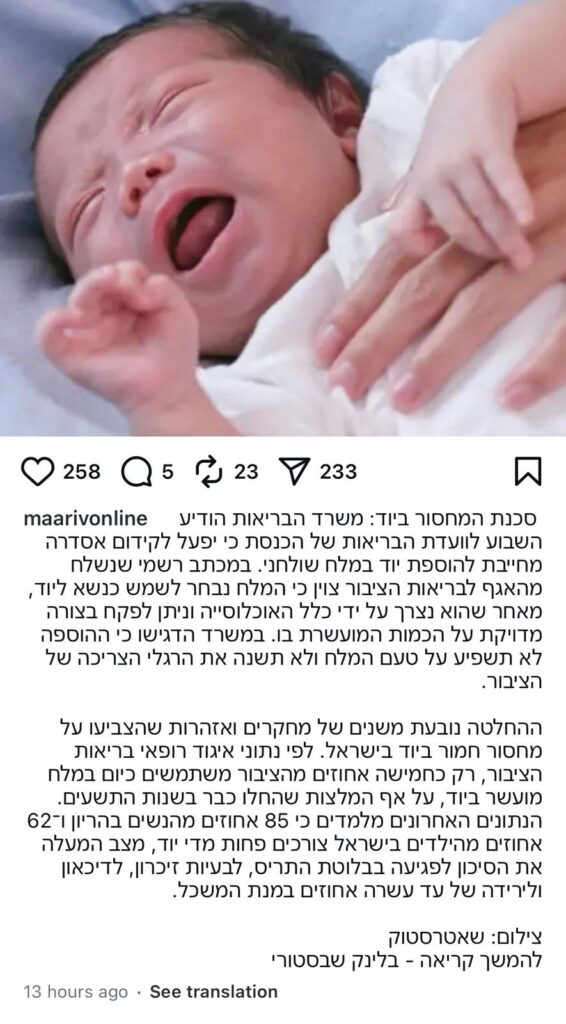 משרד הבריאות הוסיף לאחרונה המלצות לנשים לצרוך סביב ההיריון יוד, ויטמין D בנוסף לחומצה פולית וברזל שהמליץ עליהם מזמן.