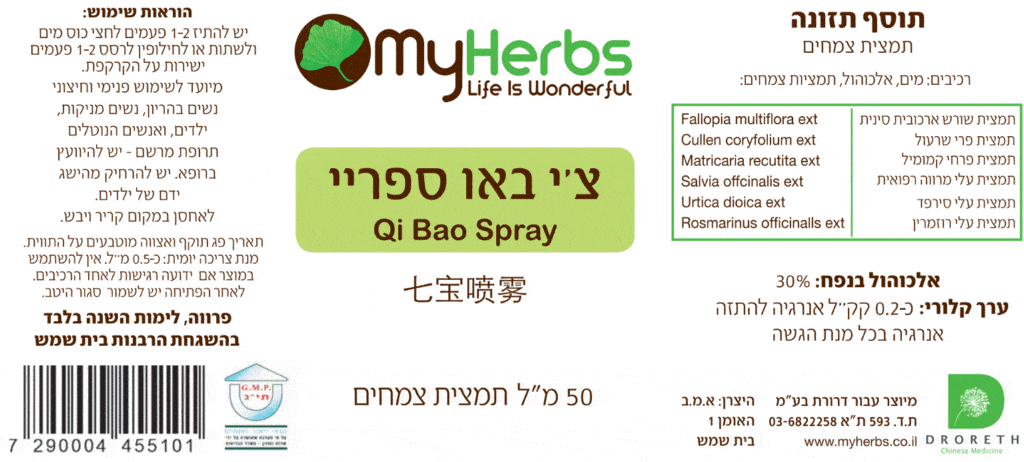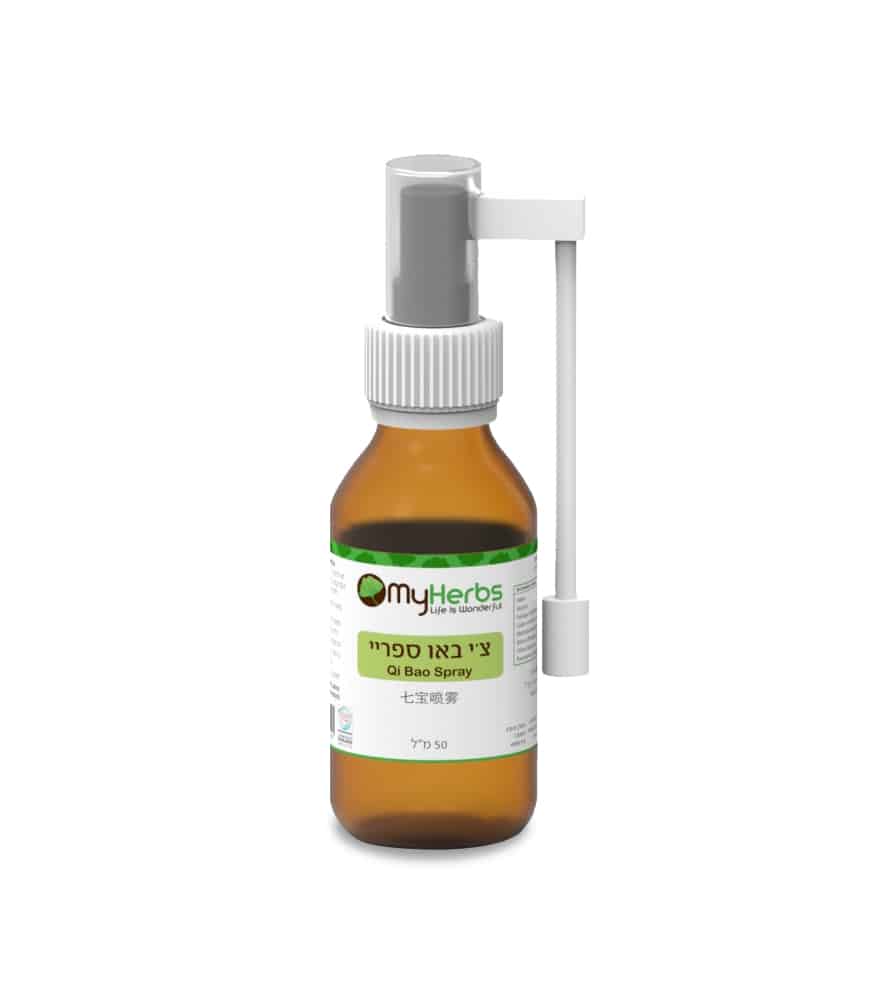 הערה: צ'י באו ספריי משמש כטיפול מקומי. לטיפול מושלם מומלץ להשתמש גם בטבליות צ'י באו בשימוש פנימי ומכשיר דרמה רולר המיועד לעיסוי הקרקפת.